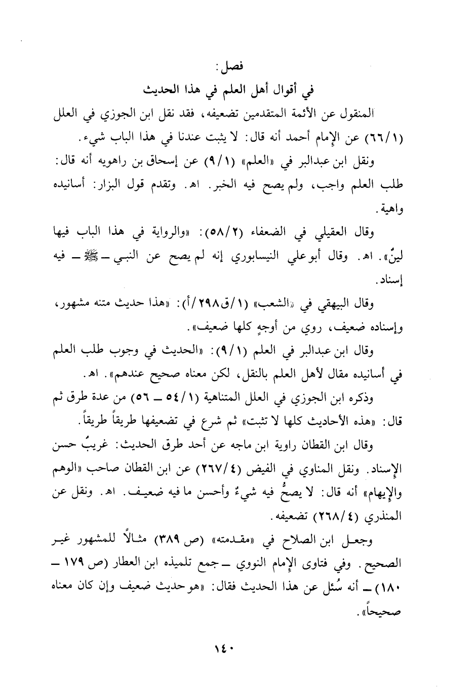 وقال ابن عبد البر في العلم (1/ 9): "الحديث في وجوب طلب العلم في أسانيده مقال لأهل العلم بالنقل، لكن معناه صحيح عندهم". أهـ.