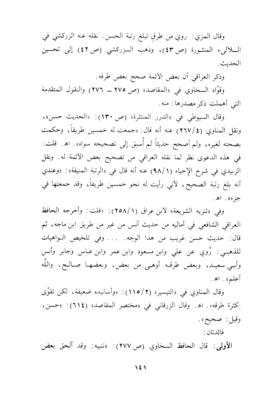 وقال السيوطي في "الدرر المنتثرة" (ص 130): "الحديث حسن"، ونقل المناوي (4/ 267) عنه أنه قال: "جمعت له خمسين طريقًا، وحكمت بصحته لغيره، ولم أصحح حديثًا لم أُسبق إلى تصحيحه سواه". أهـ. قلت: في هذه الدعوى نظر لما نقله العراقي من تصحيح بعض الأئمة له. ونقل الزبيدي في شرح الإِحياء (1/ 98) عنه أنه قال في "الرتبة المنيفة". "وعندي أنه بلغ رتبة الصحيح؛ لأني رأيت له نحو خمسين طريقًا، وقد جمعتها في جزء". أهـ.