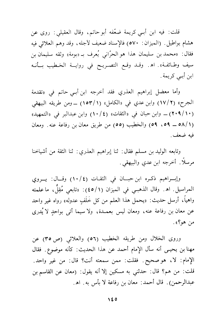قلت: فيه ابن أبي كريمة ضعّفه أبو حاتم، وقال العقيلي: روى عن هشام بواطيل. (الميزان: 570) فالإِسناد ضعيف لأجله، وقد وهم العلائي فيه فقال. "محمد بن سليمان هذا هو الحرّاني يُعرف بـ"بومة" وثقه سليمان بن سيف وطائفة". أهـ. وقد وقع التصريح في رواية الخطيب بأنه ابن أبي كريمة.