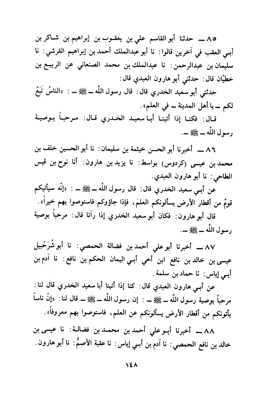 عن أبي هارون العبدي قال: كنا إذا أتينا أبا سعيد الخدري قال لنا: مرحبًا بوصية رسول الله - صلى الله عليه وسلم -: إن رسول الله - صلى الله عليه وسلم - قال لنا: "إنّ ناسًا يأتونكم من أقطار الأرض يسألونكم عن العلم، فاستوصوا بهم معروفًا".