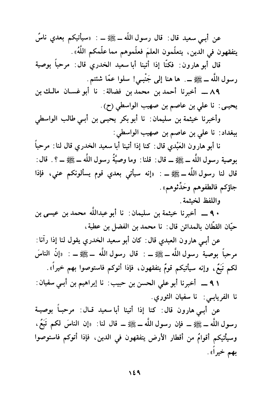 عن أبي هارون قال: كنا إذا أتينا أبا سعيد قال: مرحبًا بوصية رسول الله - صلى الله عليه وسلم - فإن رسول الله - صلى الله عليه وسلم - قال لنا: "إن الناسَ لكم تَبَعٌ، وسيأتيكمِ أقوامٌ من أقطار الأرض يتفقهون في الدين، فإذا أتوكم فاستوصوا بهم خيرًا".