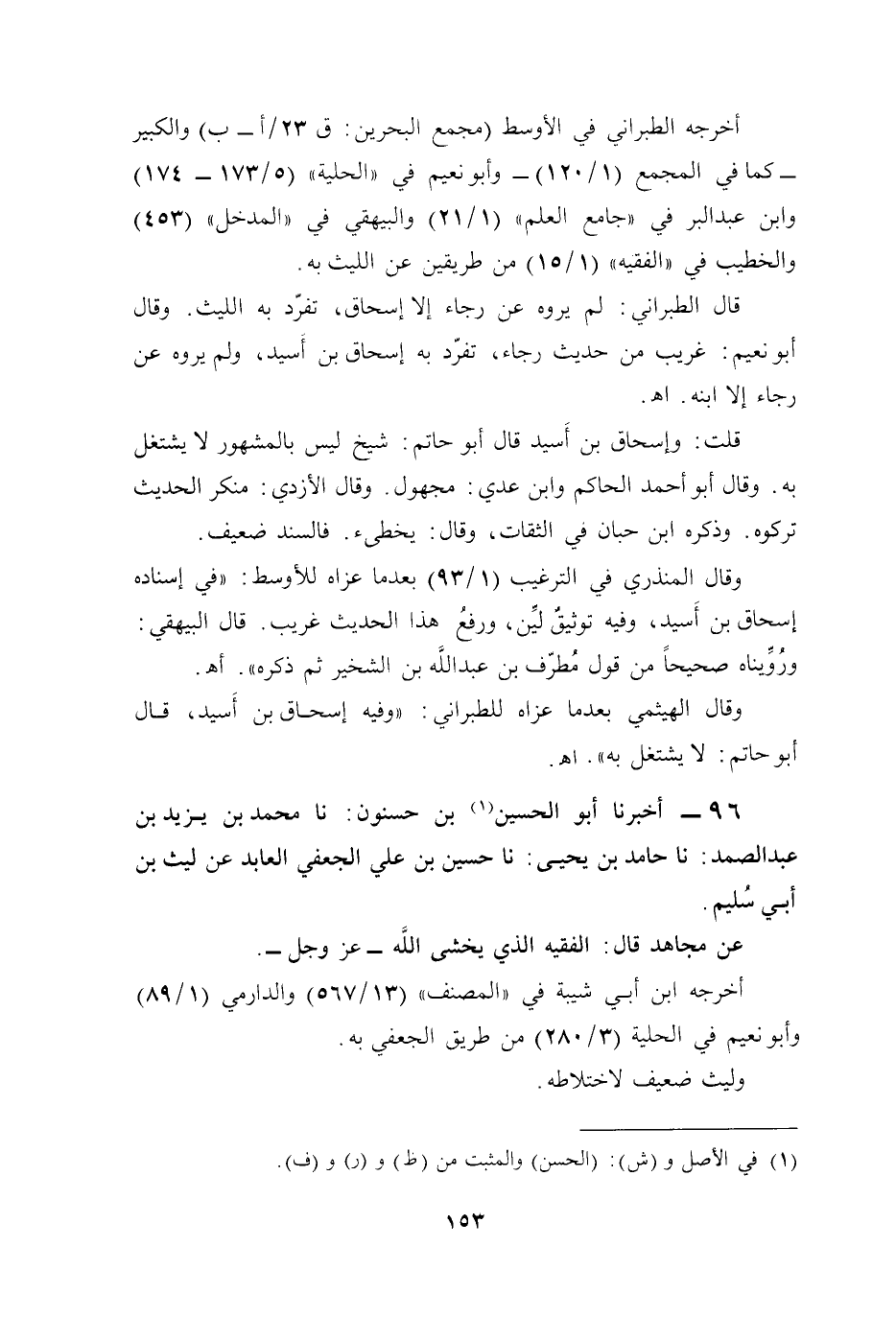 96 - أخبرنا أبو الحسين (¬1) بن حسنون: نا محمد بن يزيد بن عبد الصمد. نا حامد بن يحيى. نا حسين بن علي الجعفي العابد عن ليث بن أبي سُليم.
