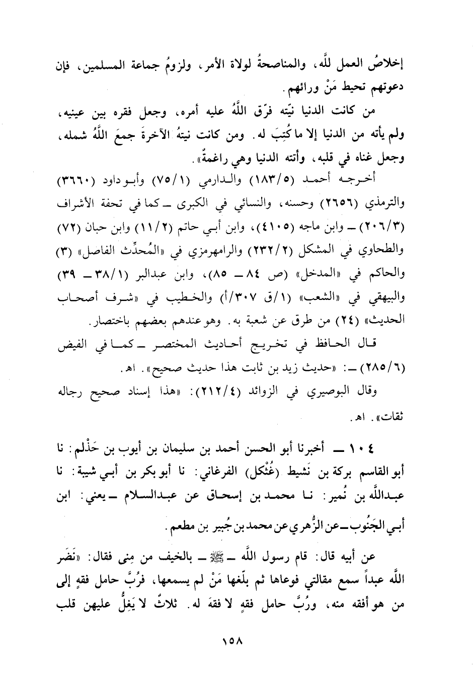 عن أبيه قال: قام رسول الله - صلى الله عليه وسلم - بالخيف من مِنى فقال: "نَضَر الله عبدًا سمع مقالتي فوعاها ثم بلّغها مَنْ لم يسمعها، فرُبَّ حامل فقهٍ إلى من هو أفقه منه، ورُبَّ حامل فقهٍ لا فقهَ له. ثلاثٌ لا يَغِلُّ عليهن قلب