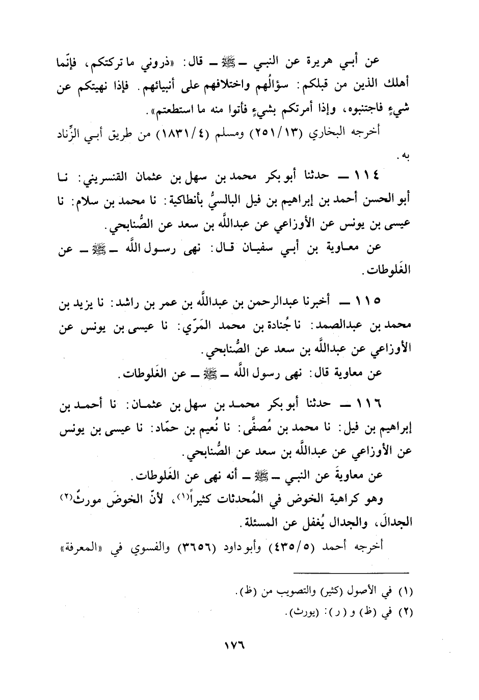114 - حدثنا أبو بكر محمد بن سهل بن عثمان القنسريني: نا أبو الحسن أحمد بن إبراهيم بن فيل البالسيُّ بأنطاكية: نا محمد بن سلام: نا عيسى بن يونس عن الأوزاعي عن عبد الله بن سعد عن الصُّنابحي.