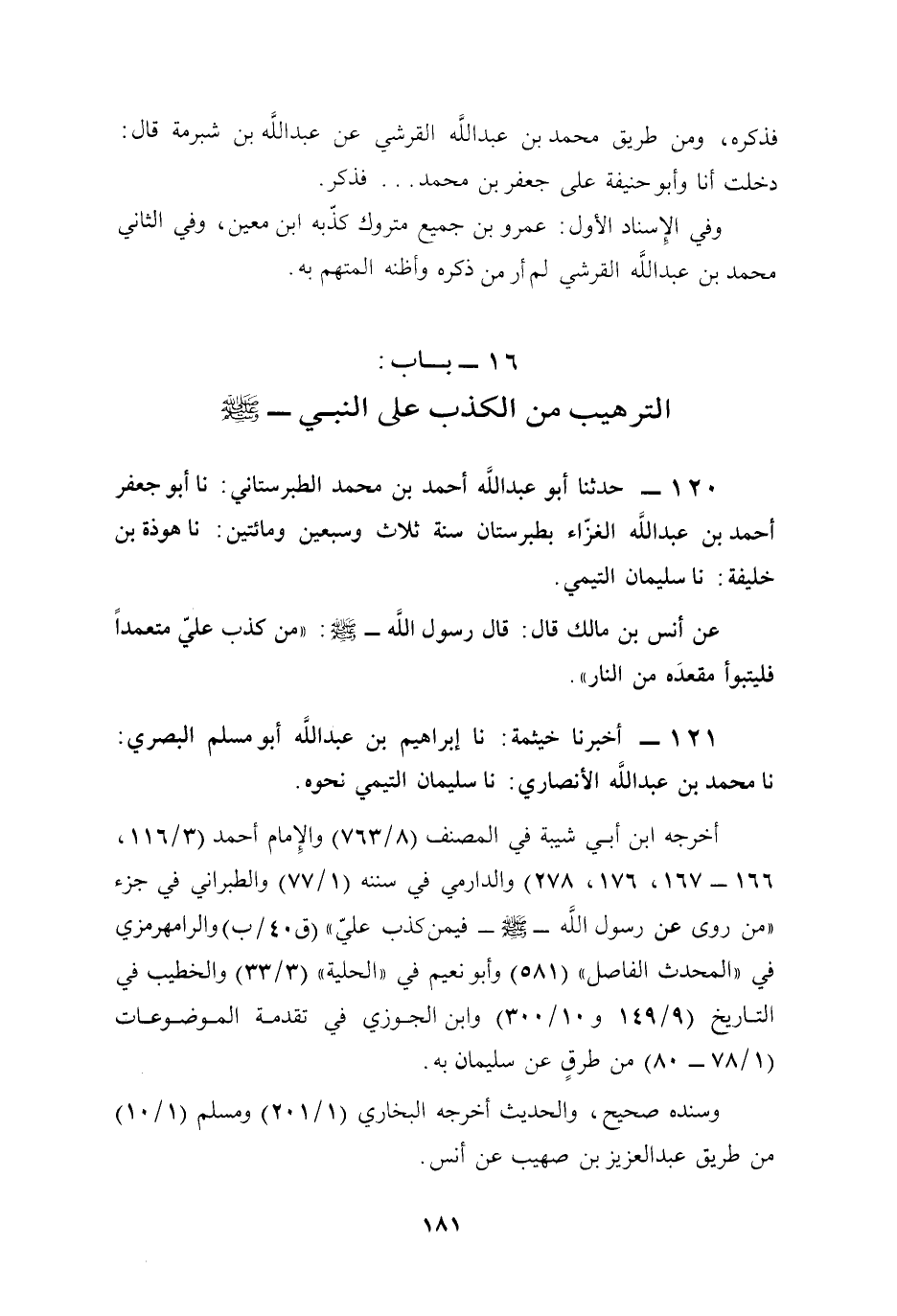 121 - أخبرنا خيثمة: نا إبراهيم بن عبد الله أبو مسلم البصري: نا محمد بن عبد الله الأنصاري: نا سليمان التيمي نحوه.