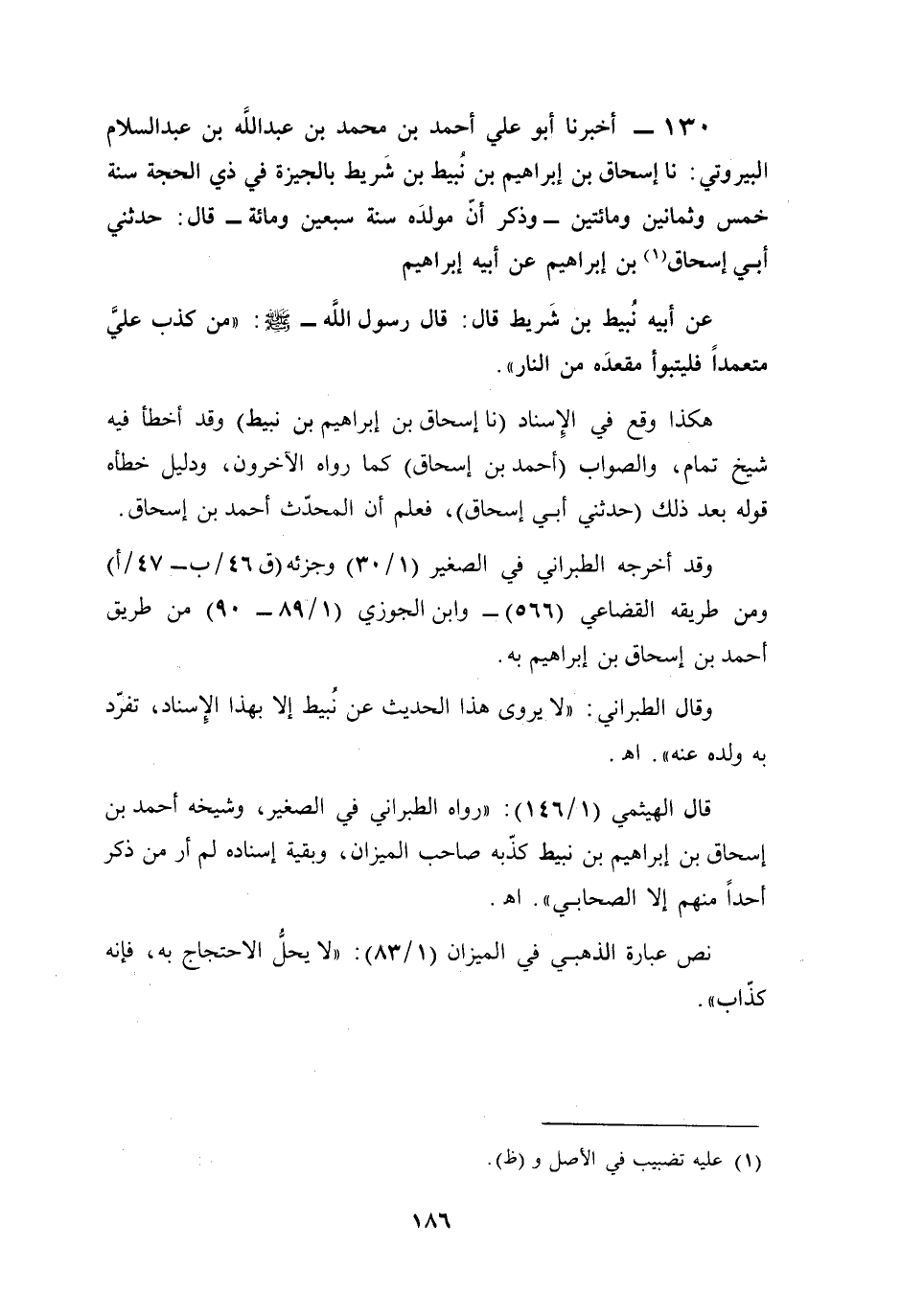 130 - أخبرنا أبو علي أحمد بن محمد بن عبد الله بن عبد السلام البيروتي: نا إسحاق بن إبراهيم بن نُبيط بن شَريط بالجيزة في ذي الحجة سنة خمس وثمانين ومائتين -وذكر أنّ مولدَه سنة سبعين ومائة- قال: حدثني أبي إسحاق (¬1) بن إبراهيم عن أبيه إبراهيم