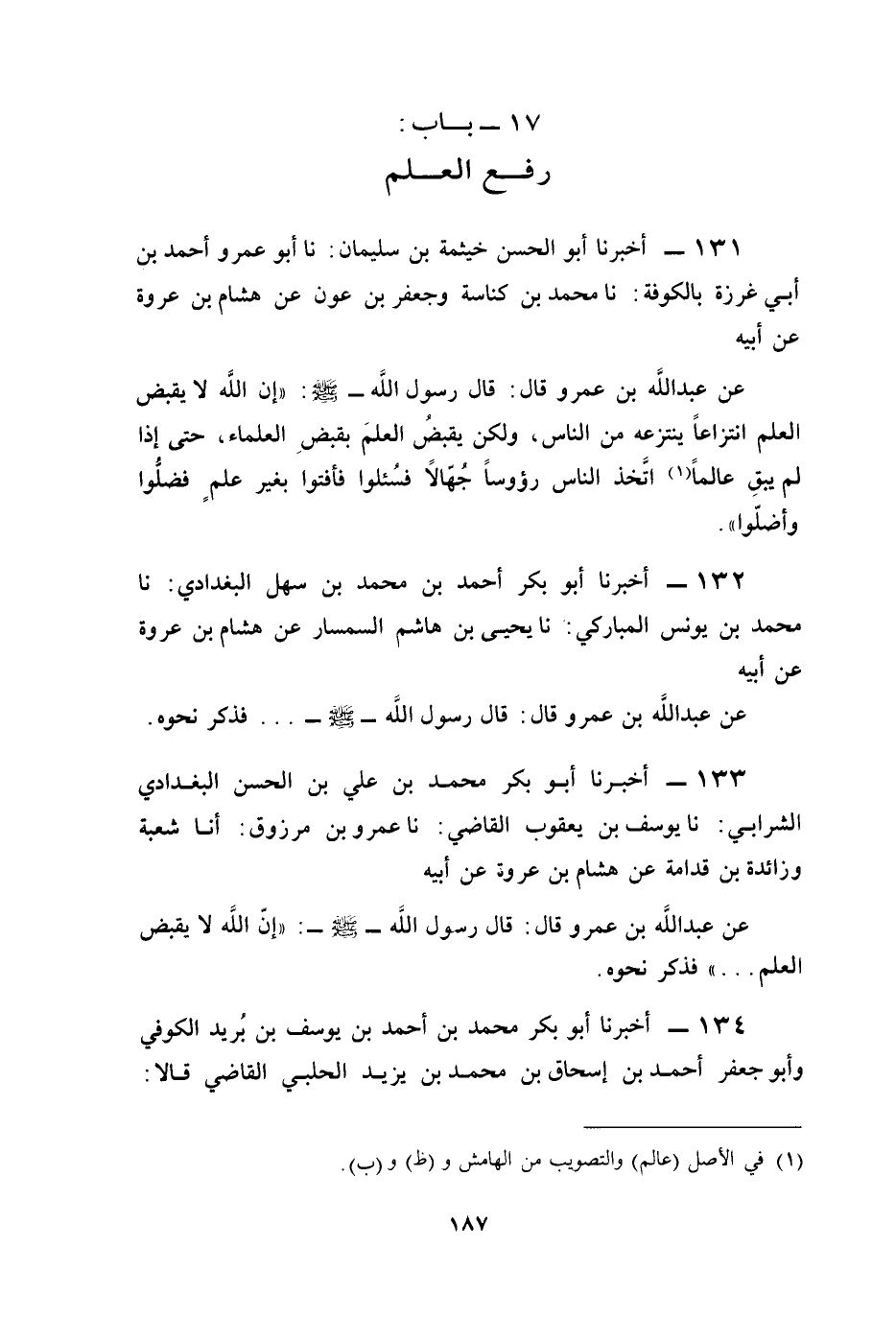 عن عبد الله بن عمرو قال: قال رسول الله - صلى الله عليه وسلم -: "إنّ الله لا يقبض العلم ... " فذكر نحوه.