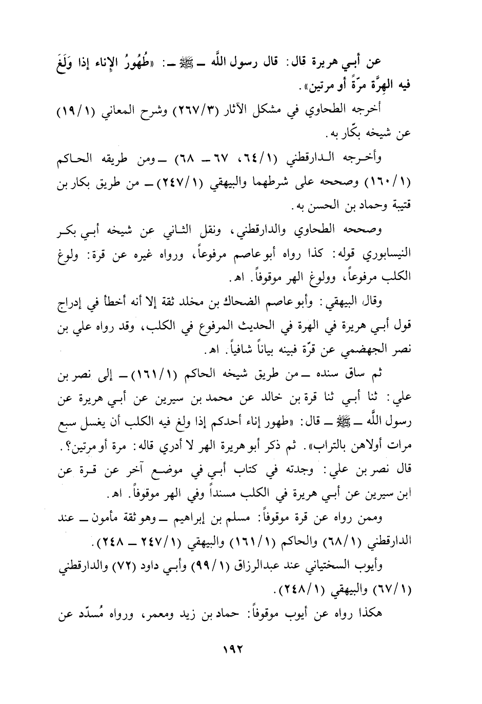 ثم ساق سنده -من طريق شيخه الحاكم (1/ 161) - إلى نصر بن علي: ثنا أبي ثنا قرة بن خالد عن محمد بن سيرين عن أبي هريرة عن رسول الله - صلى الله عليه وسلم - قال: "طهور إناء أحدكم إذا ولغ فيه الكلب أن يغسل سبع مرات أولاهن بالتراب". ثم ذكر أبو هريرة الهر لا أدري قاله: مرة أو مرتين؟. قال نصر بن علي: وجدته في كتاب أبي في موضع آخر عن قرة عن ابن سيرين عن أبي هريرة في الكلب مسندًا وفي الهر موقوفًا. أهـ.