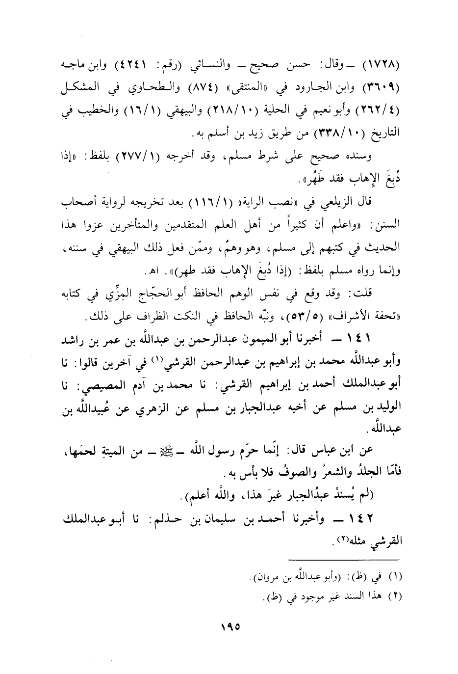 قال الزيلعي في "نصب الراية" (1/ 116) بعد تخريجه لرواية أصحاب السنن: "واعلم أن كثيرًا من أهل العلم المتقدمين والمتأخرين عزوا هذا الحديث في كتبهم إلى مسلم، وهو وهمٌ، وممّن فعل ذلك البيهقي في سننه، وإنما رواه مسلم بلفظ: (إذا دُبغَ الإِهاب فقد طهر) ". أهـ.