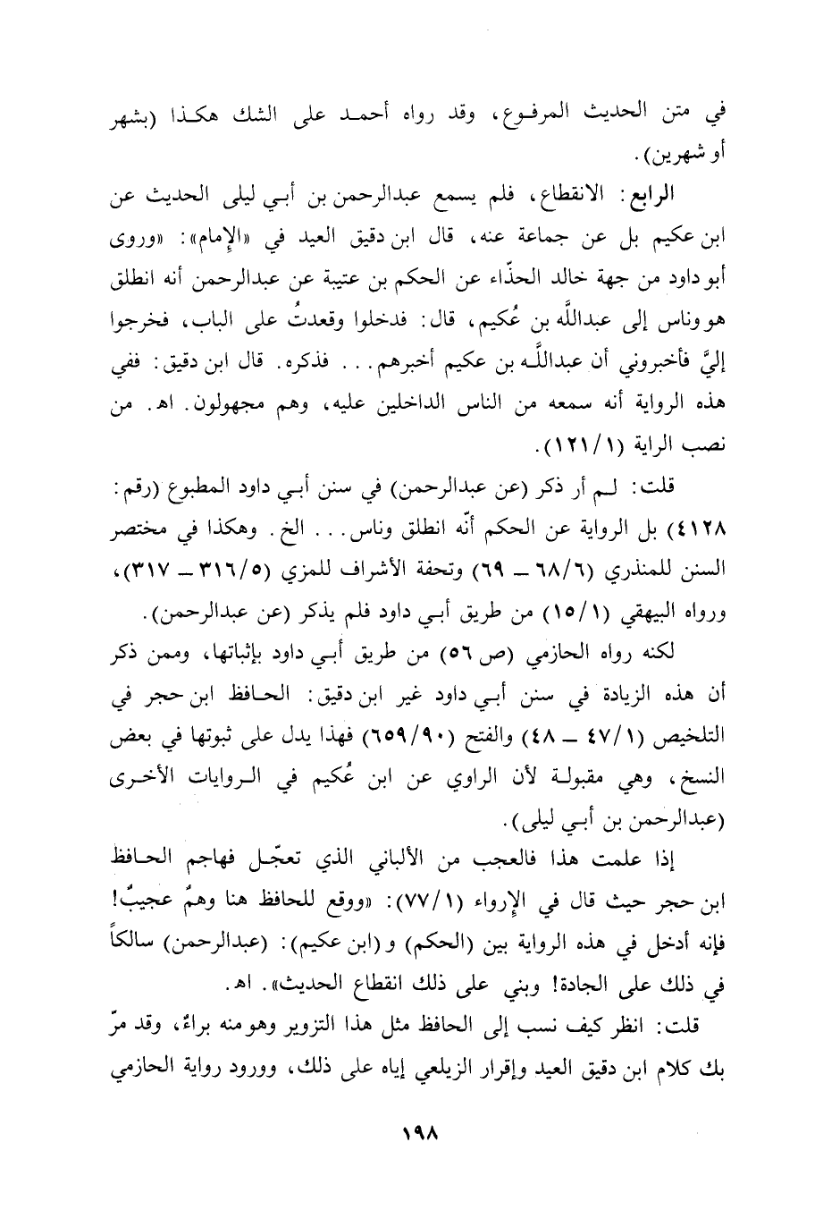 الرابع: الانقطاع، فلم يسمع عبد الرحمن بن أبي ليلى الحديث عن ابن عكيم بل عن جماعة عنه، قال ابن دقيق العيد في "الإِمام": "وروى أبو داود من جهة خالد الحذّاء عن الحكم بن عتيبة عن عبد الرحمن أنه انطلق هو وناس إلى عبد الله بن عُكيم، قال: فدخلوا وقعدتُ على الباب، فخرجوا إليَّ فأخبروني أن عبد الله بن عكيم أخبرهم ... فذكره. قال ابن دقيق: ففي هذه الرواية أنه سمعه من الناس الداخلين عليه، وهم مجهولون. أهـ. من نصب الراية (1/ 121).