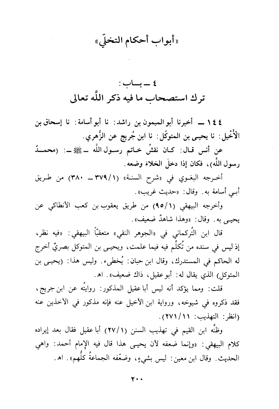 144 - أخبرنا أبو الميمون بن راشد: نا أبو أسامة: نا إسحاق بن الْأَخْيل: نا يحيى بن المتوكّل: نا ابن جُريج عن الزُّهري.