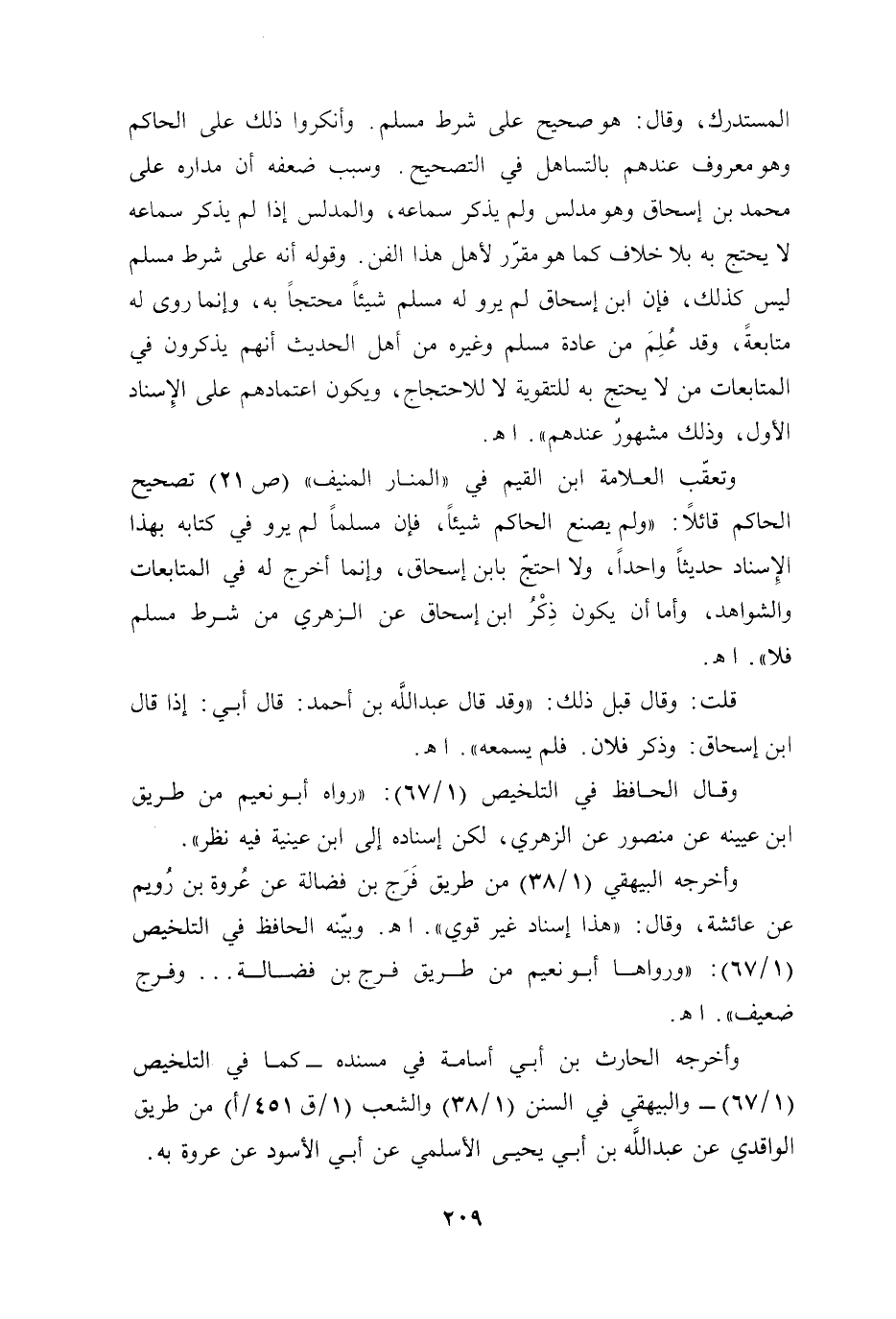 وتعقّب العلامة ابن القيم في "المنار المنيف" (ص 21) تصحيح الحاكم قائلًا: "ولم يصنع الحاكم شيئًا، فإن مسلمًا لم يرو في كتابه بهذا الإِسناد حديثًا واحدًا، ولا احتجّ بابن إسحاق، وإنما أخرج له في المتابعات والشواهد، وأما أن يكون ذِكْرُ ابن إسحاق عن الزهري من شرط مسلم فلا". أهـ.