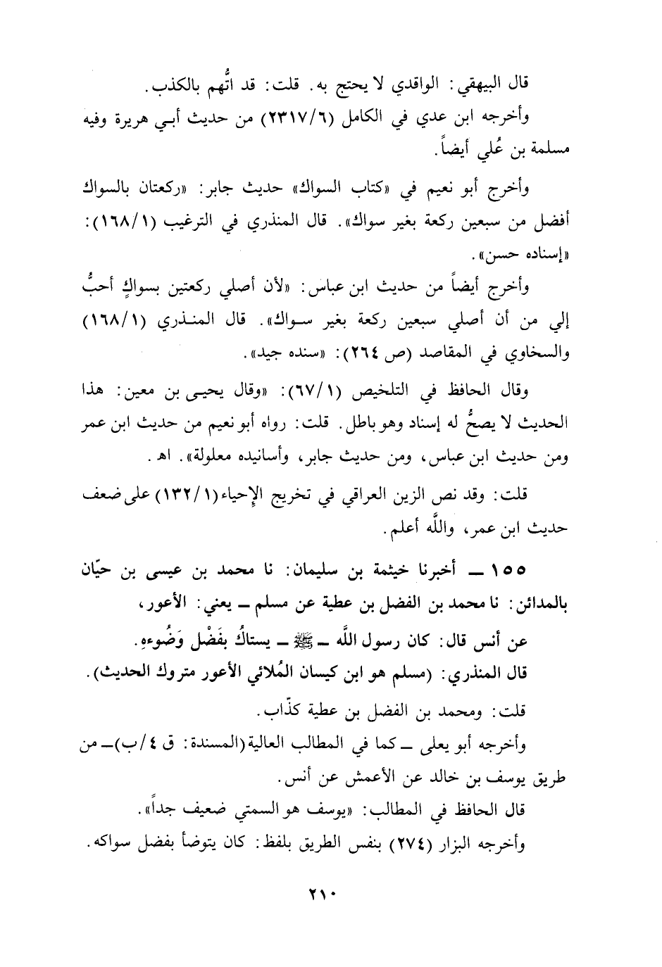 وأخرج أيضًا من حديث ابن عباس: "لأن أصلي ركعتين بسواكٍ أحبُّ إلى من أن أصلي سبعين ركعة بغير سواك". قال المنذري (1/ 168) والسخاوي في المقاصد (ص 264): "سنده جيد".