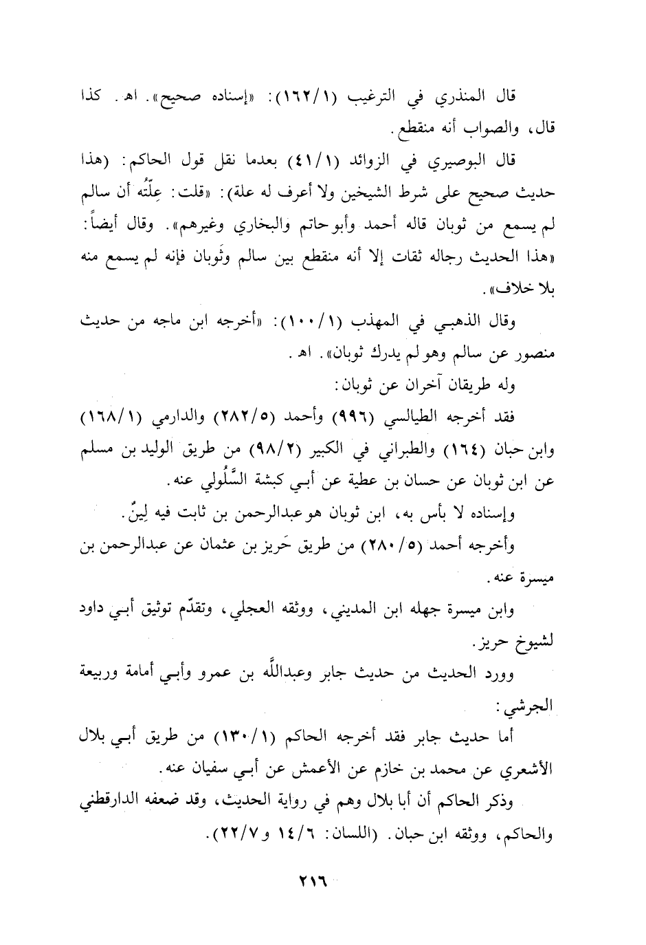 قال البوصيري في الزوائد (1/ 41) بعد ما نقل قول الحاكم. (هذا حديث صحيح على شرط الشيخين ولا أعرف له علة): "قلت: عِلّتُه أن سالم لم يسمع من ثوبان قاله أحمد وأبو حاتم والبخاري وغيرهم". وقال أيضًا: "هذا الحديث رجاله ثقات إلا أنه منقطع بين سالم وثَوبان فإنه لم يسمع منه بلا خلاف".