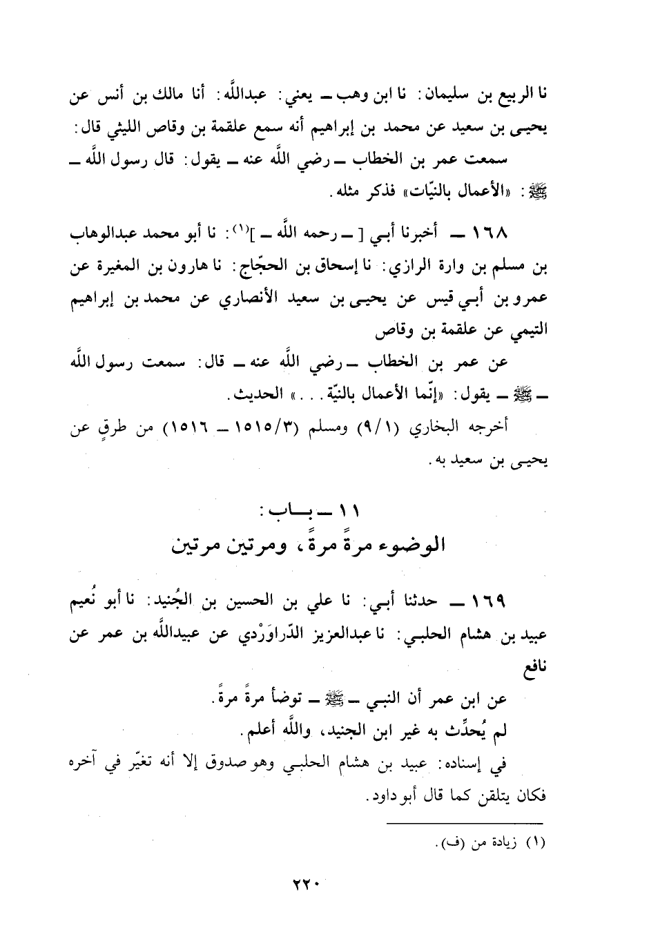 168 - أخبرنا أبي [- رحمه الله -] (¬1): نا أبو محمَّد عبد الوهاب بن مسلم بن وارة الرازي: نا إسحاق بن الحجّاج: نا هارون بن المغيرة عن عمرو بن أبي قيس عن يحيى بن سعيد الأنصاري عن محمد بن إبراهيم التيمي عن علقمة بن وقاص