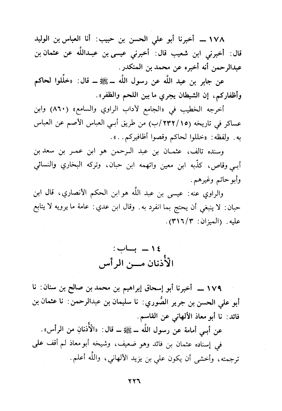 178 - أخبرنا أبو علي الحسن بن حبيب: أنا العباس بن الوليد قال: أخبرني ابن شعيب قال: أخبرني عيسى بن عبد الله عن عثمان بن عبد الرحمن أنه أخبره عن محمَّد بن المنكدر.