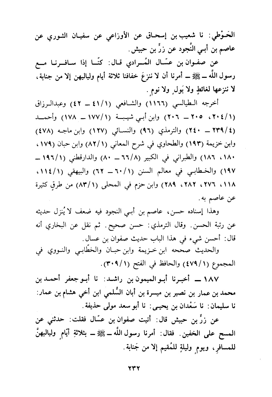 عن زرٍّ بن حبيش قال: أتيت صفوان بن عسّال فقلت: حدثني عن المسح على الخفين. فقال: أمرنا رسول الله - صلى الله عليه وسلم - بثلاثةِ أيّامٍ ولياليهنَّ للمسافرِ، ويومٍ وليلةٍ للمُقيم إلا من جَنابة.