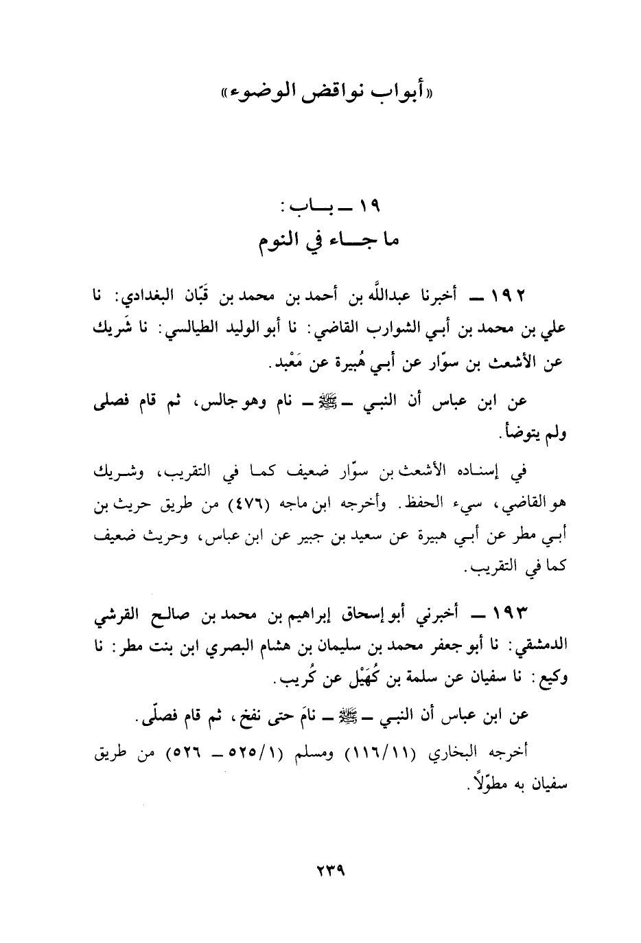 عن ابن عباس أن النبي - صلى الله عليه وسلم - نام وهو جالس، ثم قام فصلى ولم يتوضأ.