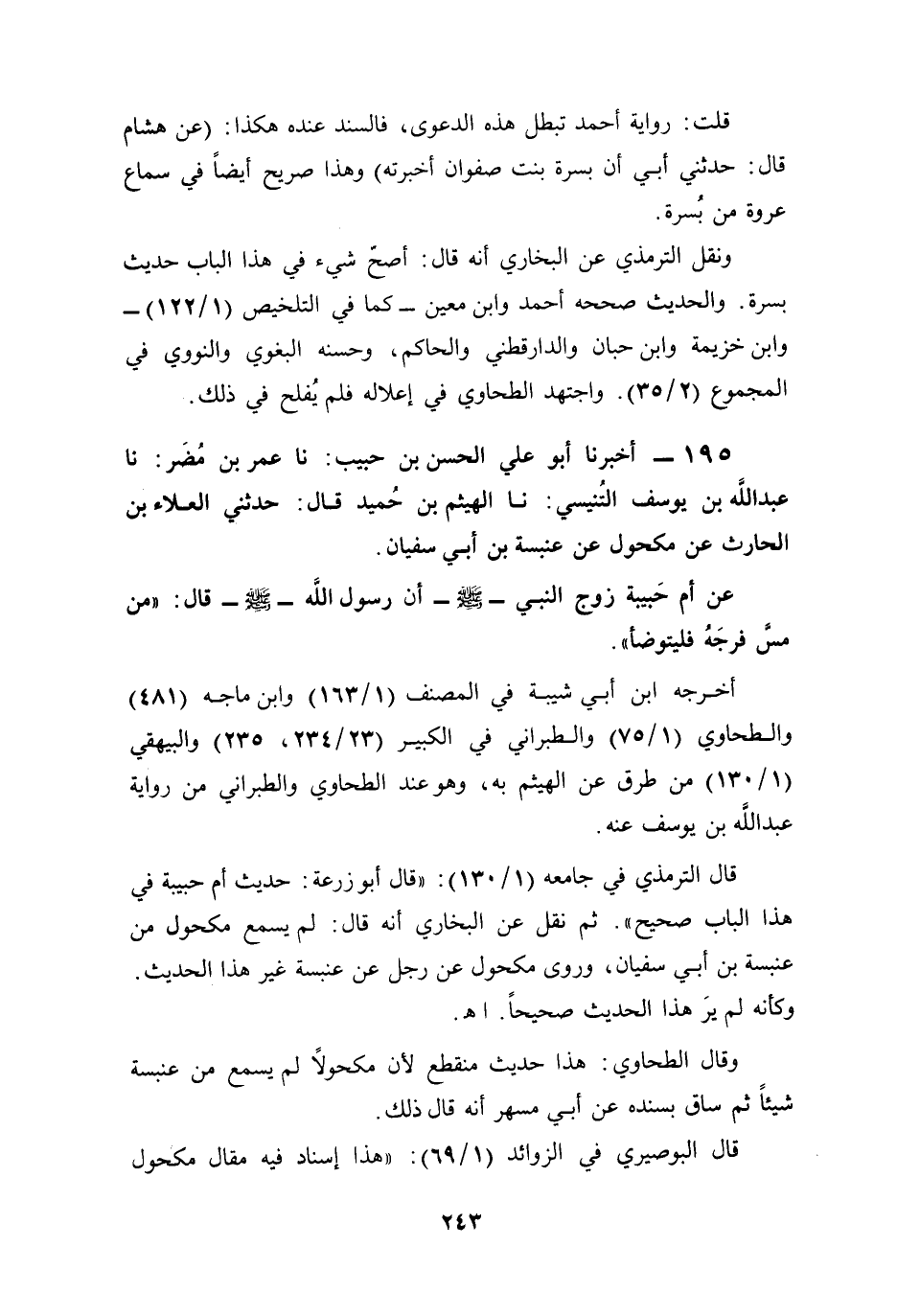 ونقل الترمذي عن البخاري أنه قال: أصحّ شيء في هذا الباب حديث بسرة. والحديث صححه أحمد وابن معين -كما في التلخيص (1/ 122) - وابن خزيمة وابن حبان والدارقطني والحاكم، وحسنه البغوي والنووي في المجموع (2/ 35). واجتهد الطحاوي في إعلاله فلم يُفلح في ذلك.