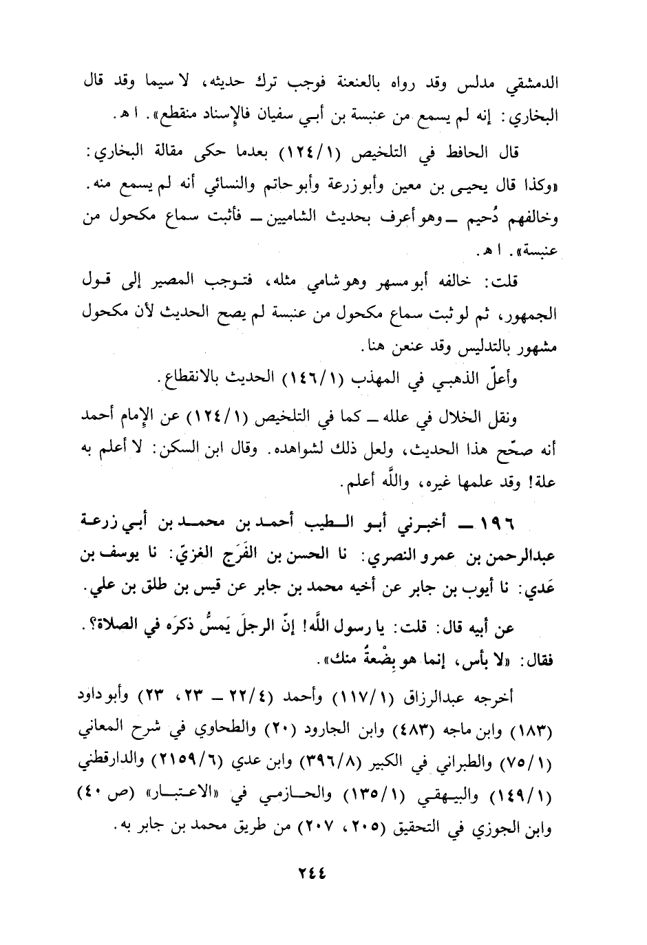 196 - أخبرني أبو الطيب أحمد بن محمَّد بن أبي زرعة عبد الرحمن بن عمرو النصري: نا الحسن بن الفَرَج الغزيّ: نا يوسف بن عَدي: نا أيوب بن جابر عن أخيه محمَّد بن جابر عن قيس بن طلق بن علي.