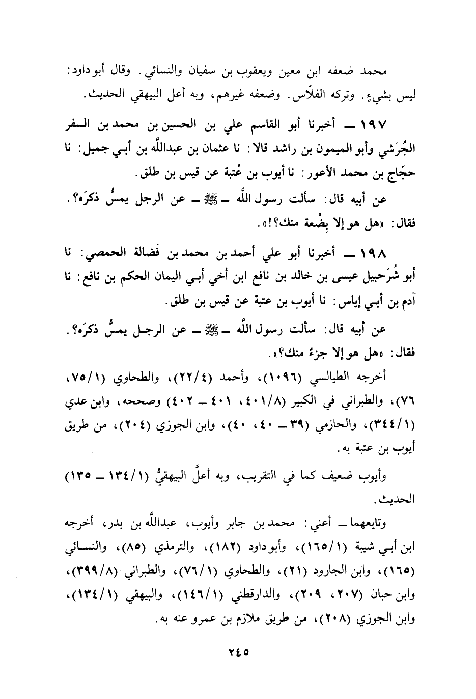 197 - أخبرنا أبو القاسم علي بن الحسين بن محمد بن السفر الجُرَشي وأبو الميمون بن راشد قالا: نا عثمان بن عبد الله بن أبي جميل: نا حجّاج بن محمَّد الأعور: نا أيوب بن عُتبة عن قيس بن طلق.