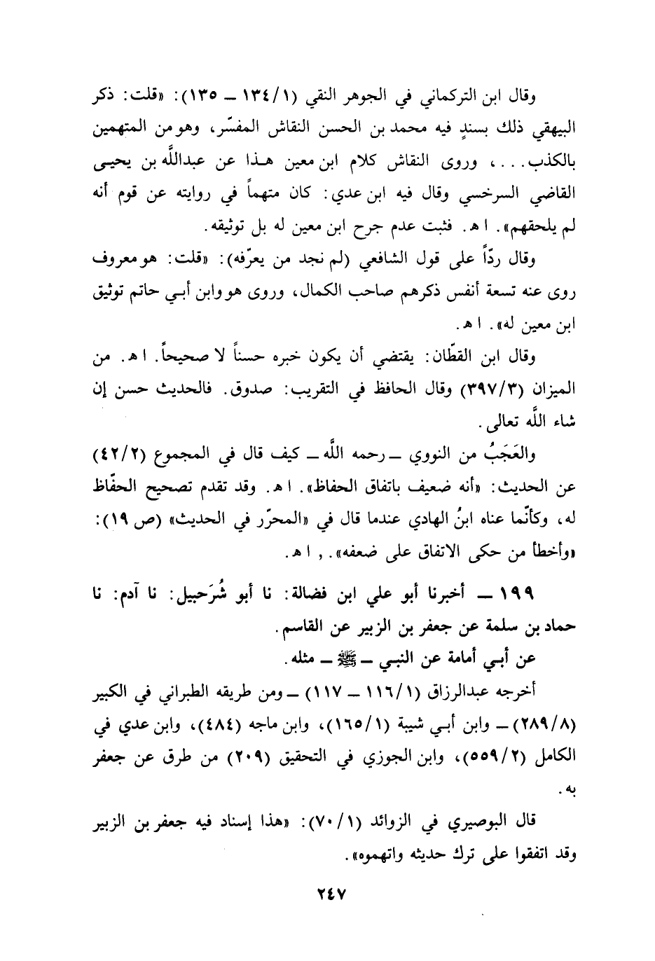 وقال ابن التركماني في الجوهر النقي (1/ 134 - 135): "قلت: ذكر البيهقي ذلك بسندٍ فيه محمَّد بن الحسن النقاش المفسّر، وهو من المتهمين بالكذب ... ، وروى النقاش كلام ابن معين هذا عن عبد الله بن يحيى القاضي السرخسي وقال فيه ابن عدي: كان متهمًا في روايته عن قوم أنه لم يلحقهم". أهـ. فثبت عدم جرح ابن معين له بل توثيقه.