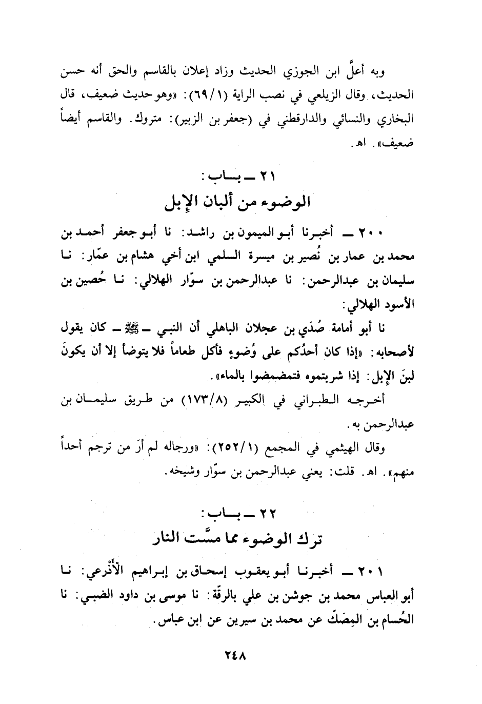 نا أبو أمامة صُدَي بن عجلان الباهلي أن النبي - صلى الله عليه وسلم - كان يقول لأصحابه: "إذا كان أحدُكم على وُضوءٍ فأكل طعامًا فلا يتوضأ إلا أن يكونَ لبنَ الإِبل: إذا شربتموه فتمضمضوا بالماء".