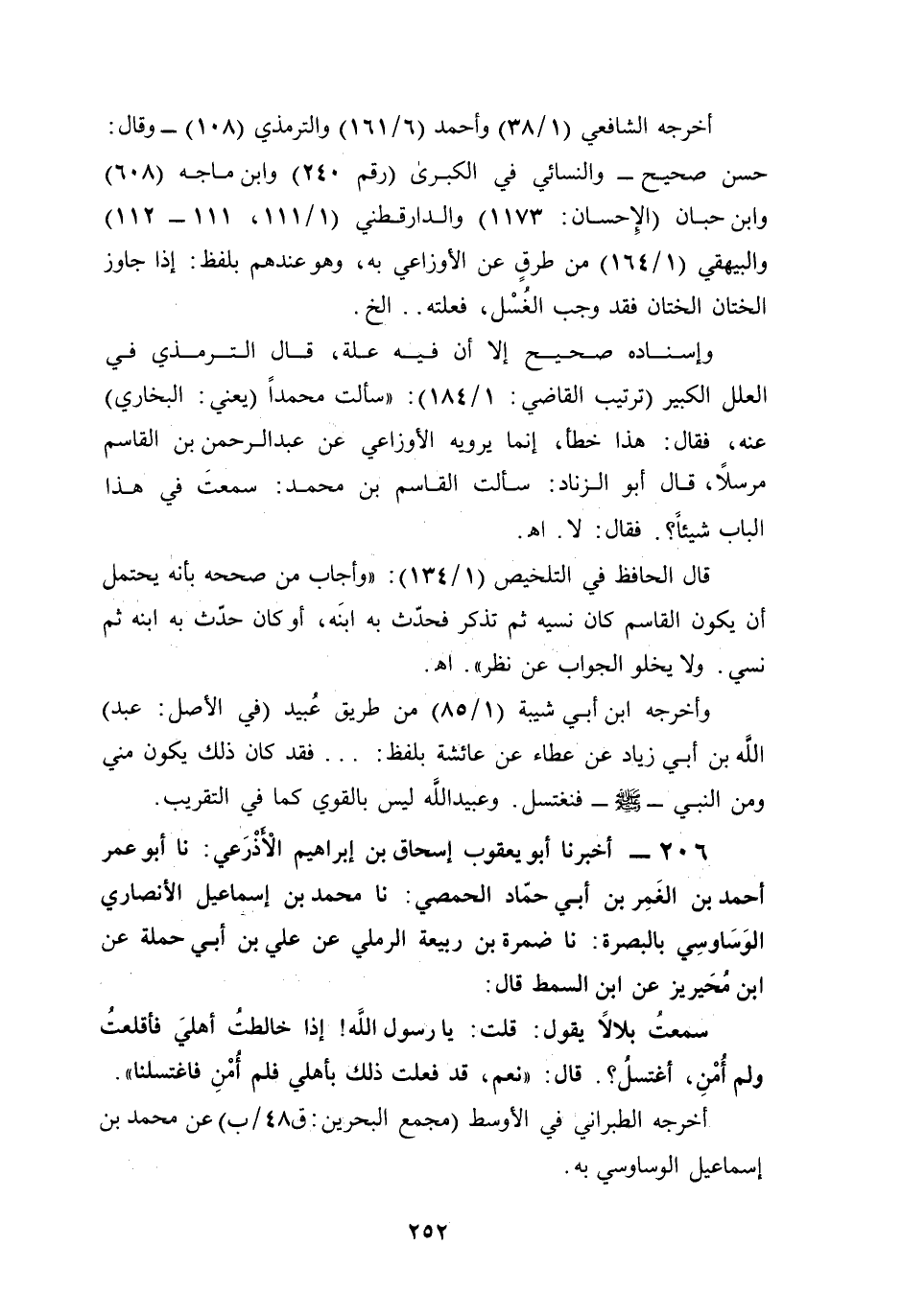 أخرجه الشافعي (1/ 38) وأحمد (6/ 161) والترمذي (108) -وقال: حسن صحيح- والنسائي في الكبرى (رقم 240) وابن ماجه (608) وابن حبان (الإِحسان: 1173) والدارقطني (1/ 111، 111 - 112) والبيهقي (1/ 164) من طرقٍ عن الأوزاعي به، وهو عندهم بلفظ: إذا جاوز الختان الختان فقد وجب الغُسْل، فعلته .. الخ.