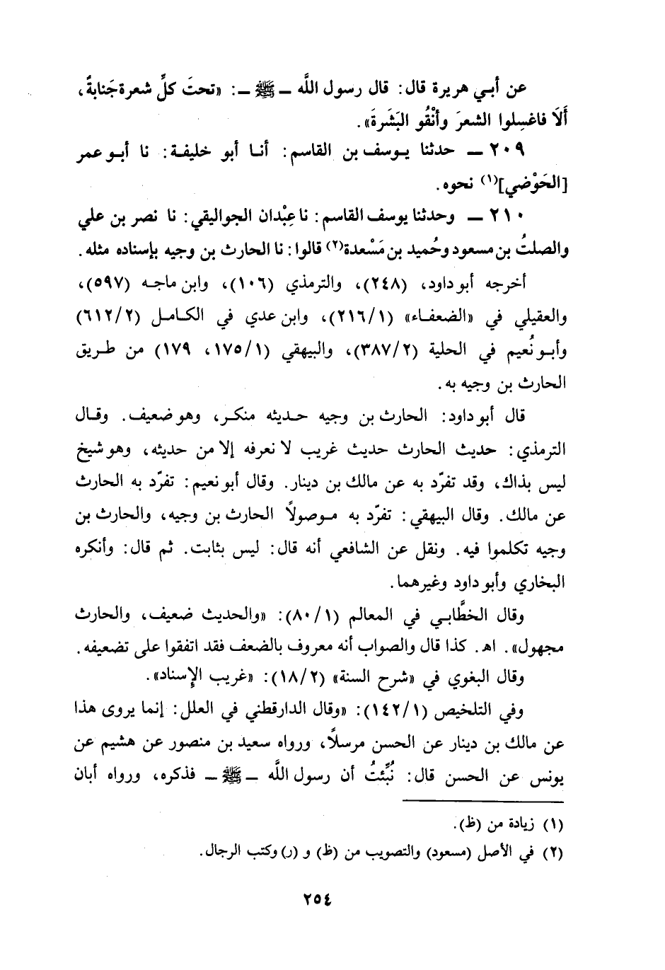 وقال الخطَّابي في المعالم (1/ 80): "والحديث ضعيف، والحارث مجهول". أهـ. كذا قال والصواب أنه معروف بالضعف فقد اتفقوا على تضعيفه.