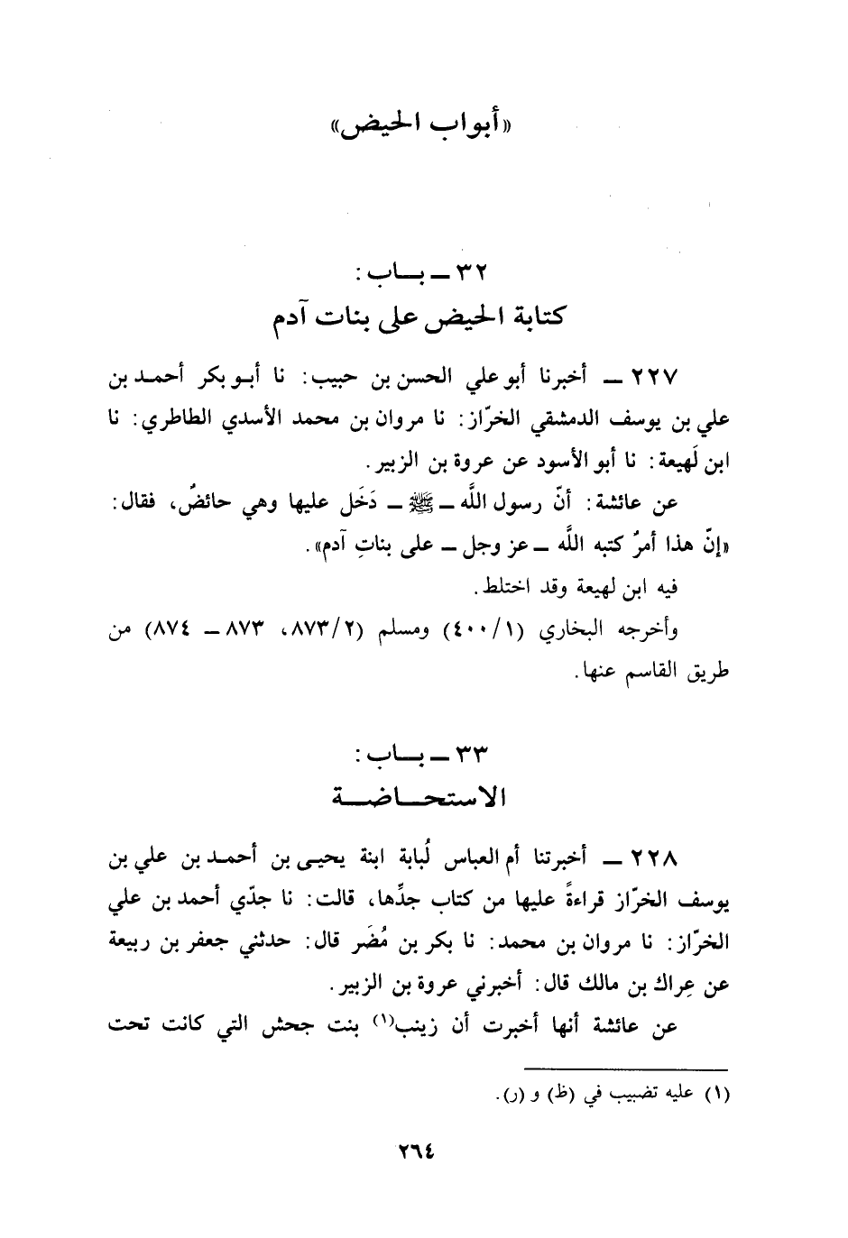 228 - أخبرتنا أم العباس لُبابة ابنة يحيى بن أحمد بن علي بن يوسف الخرّاز قراءةً عليها من كتاب جدِّها، قالت: نا جدّي أحمد بن علي الخرّاز: نا مروان بن محمَّد: نا بكر بن مُضَر قال: حدثني جعفر بن ربيعة عن عِراك بن مالك قال: أخبرني عروة بن الزبير.