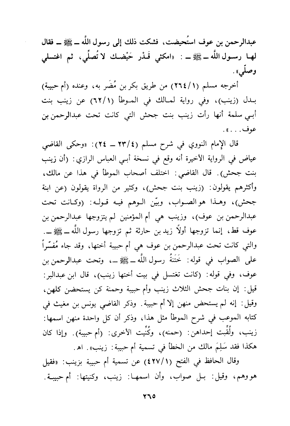 قال الإِمام النووي في شرح مسلم (4/ 23 - 24): "وحكى القاضي عياض في الرواية الأخيرة أنه وقع في نسخة أبي العباس الرازي: (أن زينب بنت جحش). قال القاضي: اختلف أصحاب الموطأ في هذا عن مالك، وأكثرهم يقولون: (زينب بنت جحش)، وكثير من الرواة يقولون (عن ابنة جحش)، وهذا هو الصواب، وبيّن الوهم فيه قوله: (وكانت تحت عبد الرحمن بن عوف)، وزينب هي أم المؤمنين لم يتزوجها عبد الرحمن بن عوف قط، إنما تزوجها أولًا زيد بن حارثة ثم تزوجها رسول الله - صلى الله عليه وسلم -. والتي كانت تحت عبد الرحمن بن عوف هي أم حبيبة أختها، وقد جاء مُفسّرًا على الصواب في قوله: خَتَنةُ رسول الله - صلى الله عليه وسلم -، وتحت عبد الرحمن بن عوف، وفي قوله: (كانت تغتسل في بيت أختها زينب)، قال ابن عبد البر: قيل: إن بنات جحش الثلاث زينب وأم حبيبة وحمنة كن يستحضن كلهن، وقيل: إنه لم يستحض منهن إلا أم حبيبة. وذكر القاضي يونس بن مغيث في كتابه الموعب في شرح الموطأ مثل هذا، وذكر أن كل واحدة منهن اسمها: زينب، ولُقِّبت إحداهن: (حمنه)، وكُنِّيت الأخرى: (أم حبيبة). وإذا كان هكذا فقد سَلِمَ مالك من الخطأ في تسمية أم حبيبة: زينب". أهـ.