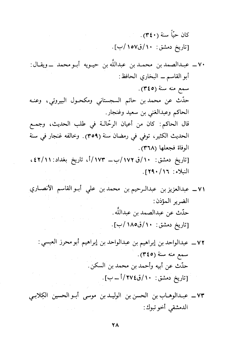73 - عبد الوهاب بن الحسن بن الوليد بن موسى أبو الحسين الكِلابي الدمشقي أخو تبوك: