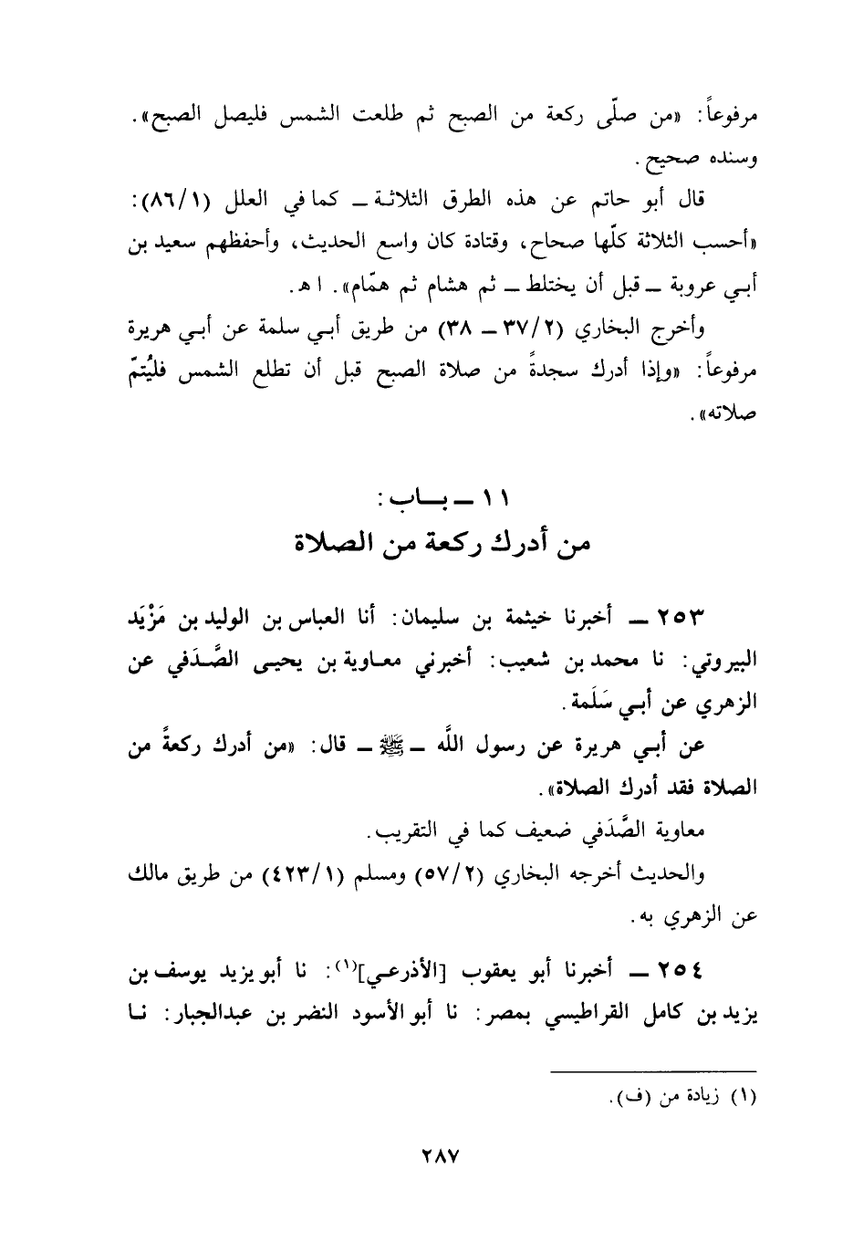 253 - أخبرنا خيثمة بن سليمان: أنا العباس بن الوليد بن مَزْيَد البيروتي: نا محمد بن شعيب: أخبرني معاوية بن يحيى الصَّدَفي عن الزهري عن أبي سَلَمة.