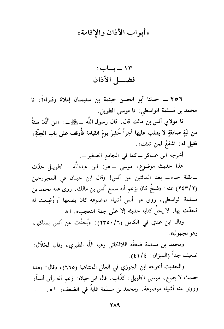 256 - حدثنا أبو الحسن خيثمة بن سليمان إملاءً وقراءةً: نا محمَّد بن مَسلمة الواسطي. نا موسى الطويل.