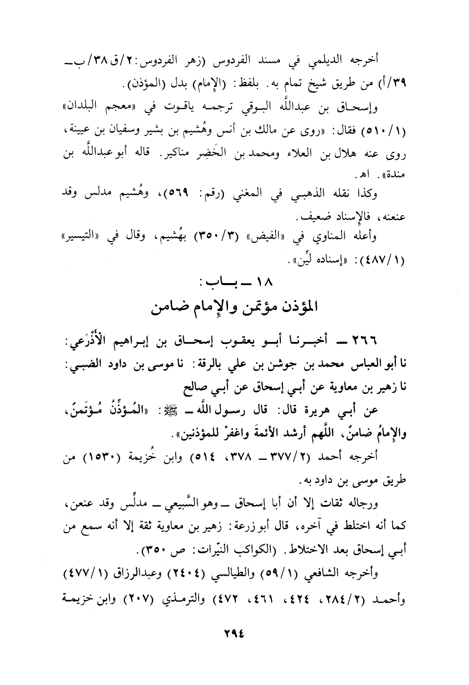 266 - أخبرنا أبو يعقوب إسحاق بن إبراهيم الْأذْرَعي: نا أبو العباس محمَّد بن جوشن بن علي بالرقة: نا موسى بن داود الضبي: نا زهير بن معاوية عن أبي إسحاق عن أبي صالح