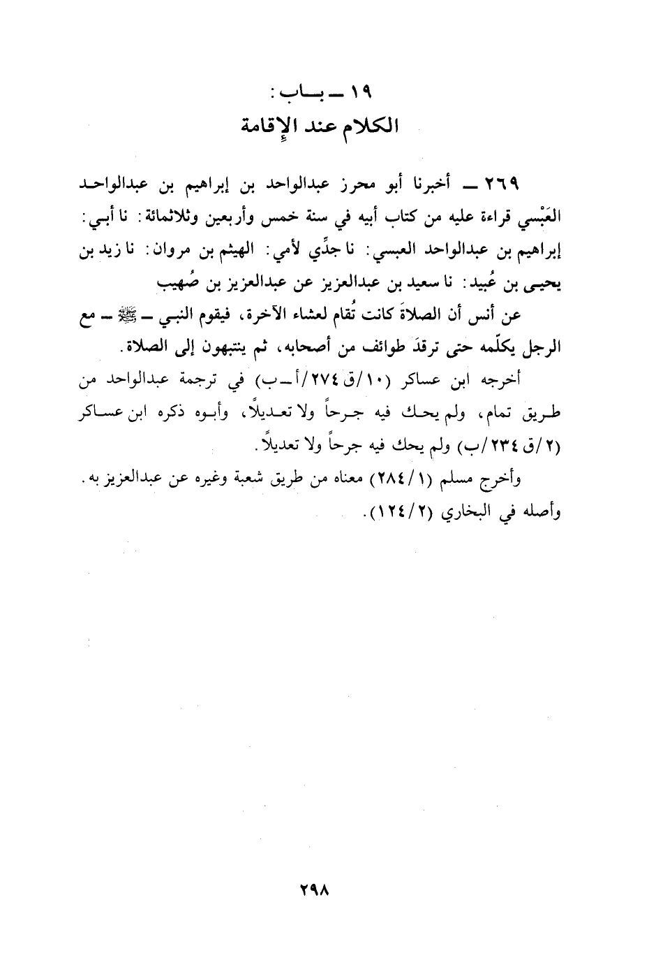 269 - أخبرنا أبو محرز عبد الواحد بن إبراهيم بن عبد الواحد العَبْسي قراءة عليه من كتاب أبيه في سنة خمس وأربعين وثلاثمائة: نا أبي: إبراهيم بن عبد الواحد العبسي: نا جدِّي لأمي: الهيثم بن مروان: نا زيد بن يحيى بن عُبيد: نا سعيد بن عبد العزيز عن عبد العزيز بن صُهيب