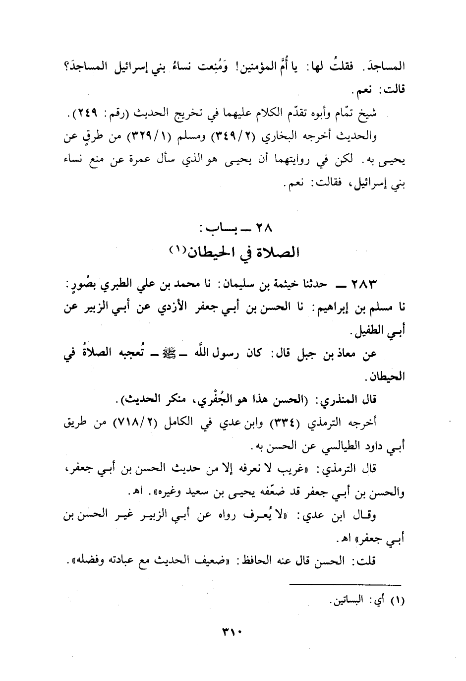 عن معاذ بن جبل قال: كان رسول الله - صلى الله عليه وسلم - تُعجبه الصلاةُ في الحيطان.