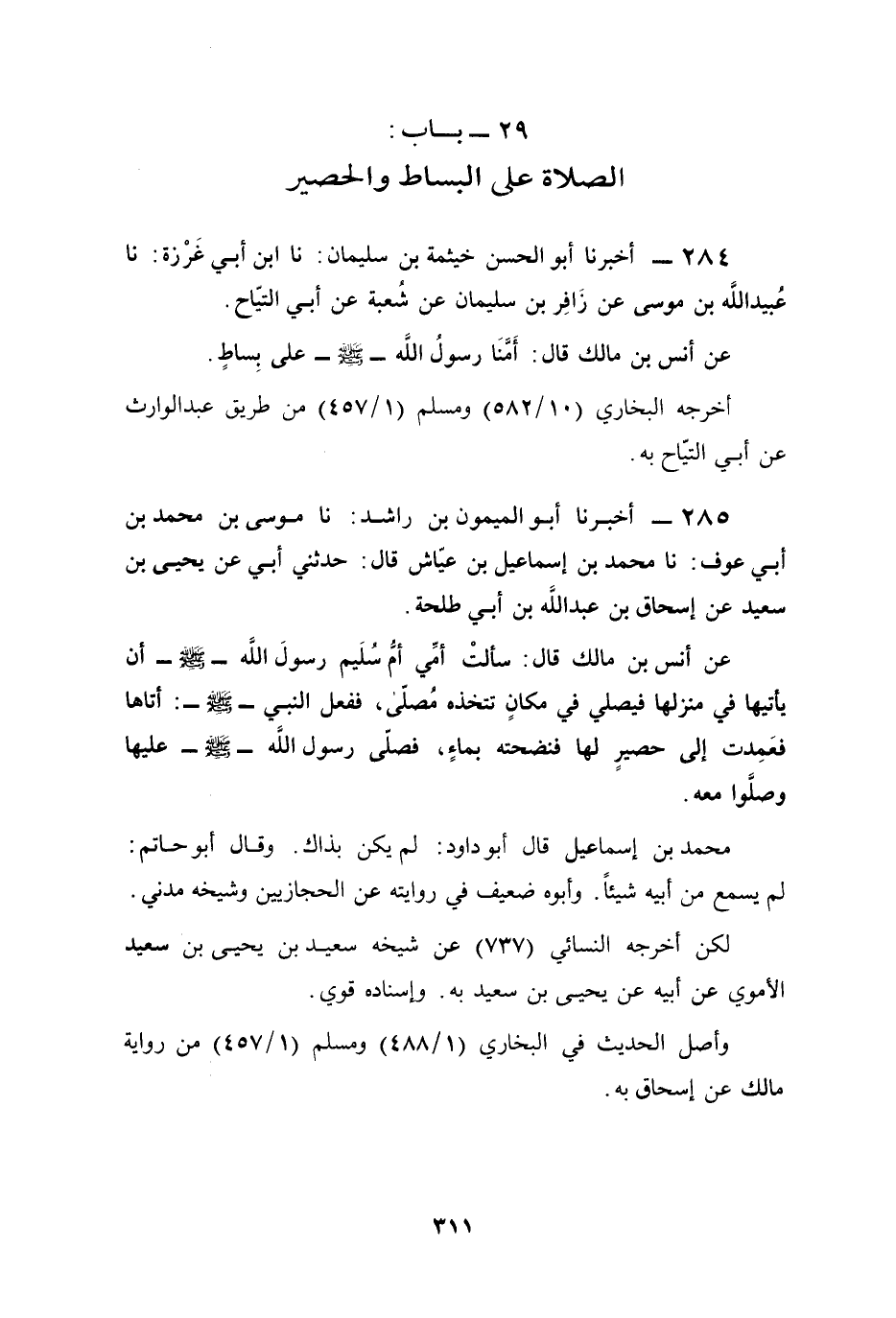 285 - أخبرنا أبو الميمون بن راشد: نا موسى بن محمَّد بن أبي عوف: نا محمَّد بن إسماعيل بن عيّاش قال: حدثني أبي عن يحيى بن سعيد عن إسحاق بن عبد الله بن أبي طلحة.