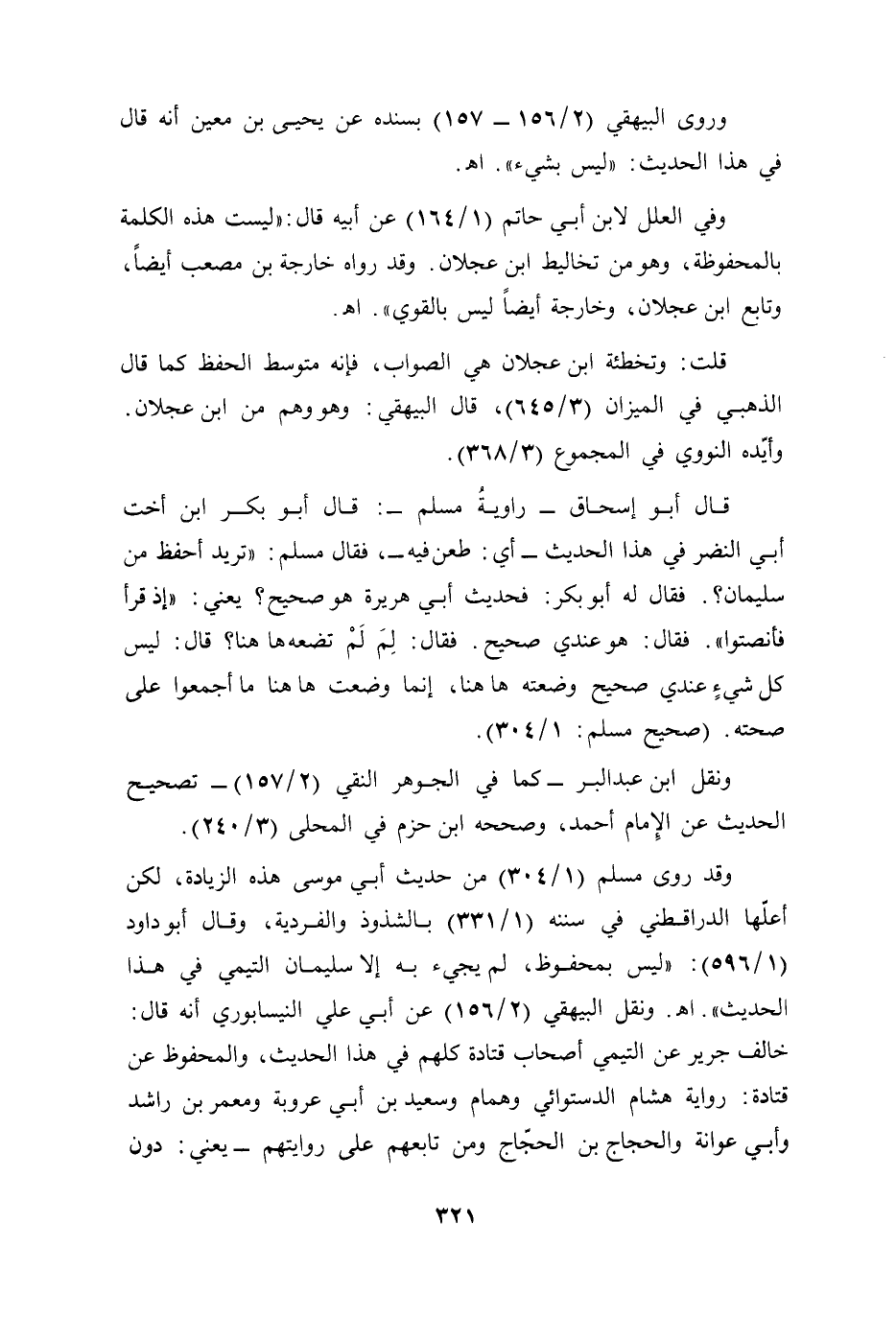 وقد روى مسلم (1/ 304) من حديث أبي موسى هذه الزيادة، لكن أعلّها الدراقطني في سننه (1/ 331) بالشذوذ والفردية، وقال أبو داود (1/ 596): "ليس بمحفوظ، لم يجيء به إلا سليمان التيمي في هذا الحديث". أهـ. ونقل البيهقي (2/ 156) عن أبي علي النيسابوري أنه قال: خالف جرير عن التيمي أصحاب قتادة كلهم في هذا الحديث، والمحفوظ عن فتادة: رواية هشام الدستوائي وهمام وسعيد بن أبي عروبة ومعمر بن راشد وأبي عوانة والحجاج بن الحجّاج ومن تابعهم على روايتهم -يعني: دون