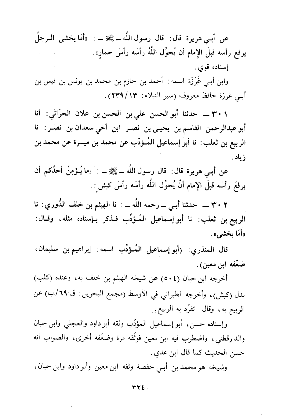 302 - حدثنا أبي -رحمه الله-: نا الهيثم بن خلف الدُّوري: نا الربيع بن ثعلب: نا أبو إسماعيل المُؤدِّب فذكر بإسناده مثله، وقال: "أَمَا يخشى".