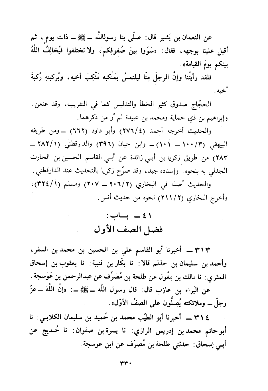 313 - أخبرنا أبو القاسم علي بن الحسين بن محمد بن السفر، وأحمد بن سليمان بن حذلم قالا: نا بكّار بن قتيبة: نا يعقوب بن إسحاق المقري: نا مالك بن مِغْول عن طلحه بن مُصَرِّف عن عبد الرحمن بن عَوْسجة.