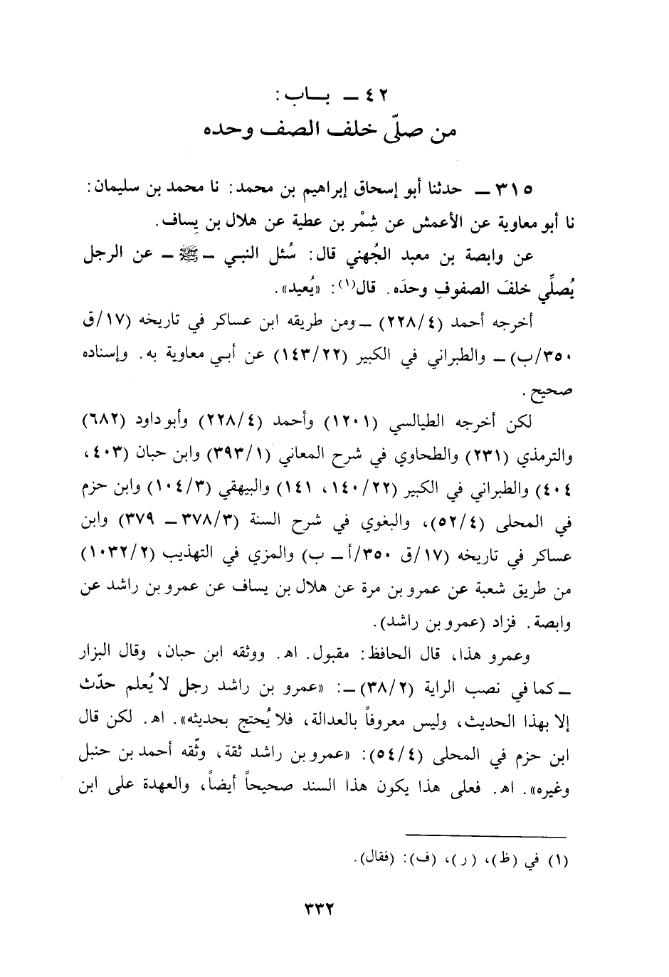 عن وابصة بن معبد الجُهني قال: سُئل النبي - صلى الله عليه وسلم - عن الرجل يُصلِّي خلفَ الصفوفِ وحدَه. قال (¬1): "يُعيد".