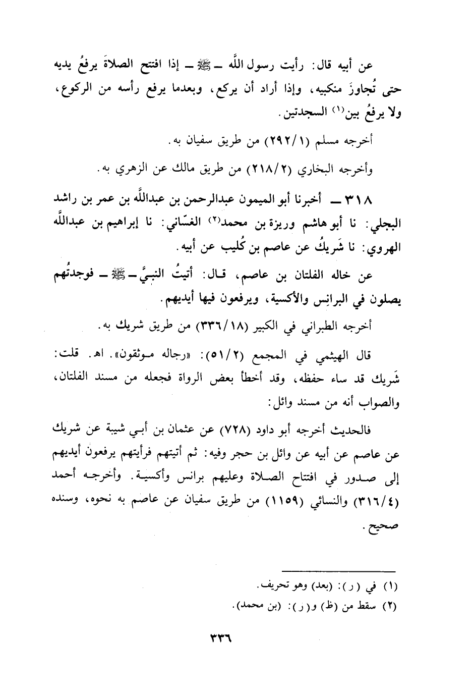 318 - أخبرنا أبو الميمون عبد الرحمن بن عبد الله بن عمر بن راشد البجلي: نا أبو هاشم وريزة بن محمد (¬2) الغسّاني: نا إبراهيم بن عبد الله الهروي: نا شَريكُ عن عاصم بن كُليب عن أبيه.