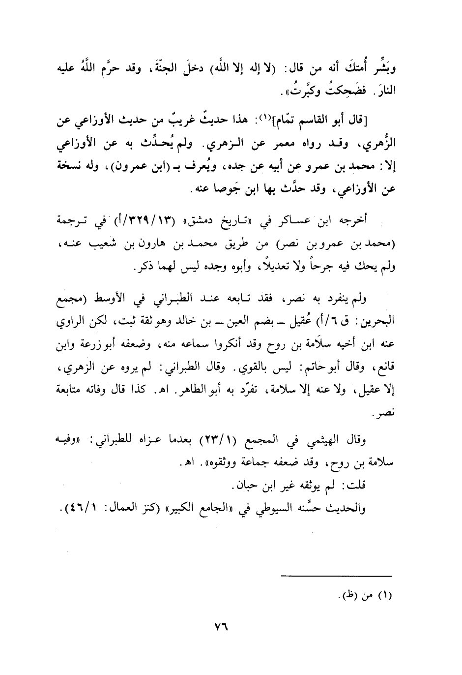 وقال الهيثمي في المجمع (1/ 23) بعد ما عزاه للطبراني: "وفيه سلامة بن روح، وقد ضعفه جماعة ووثقوه". أهـ.