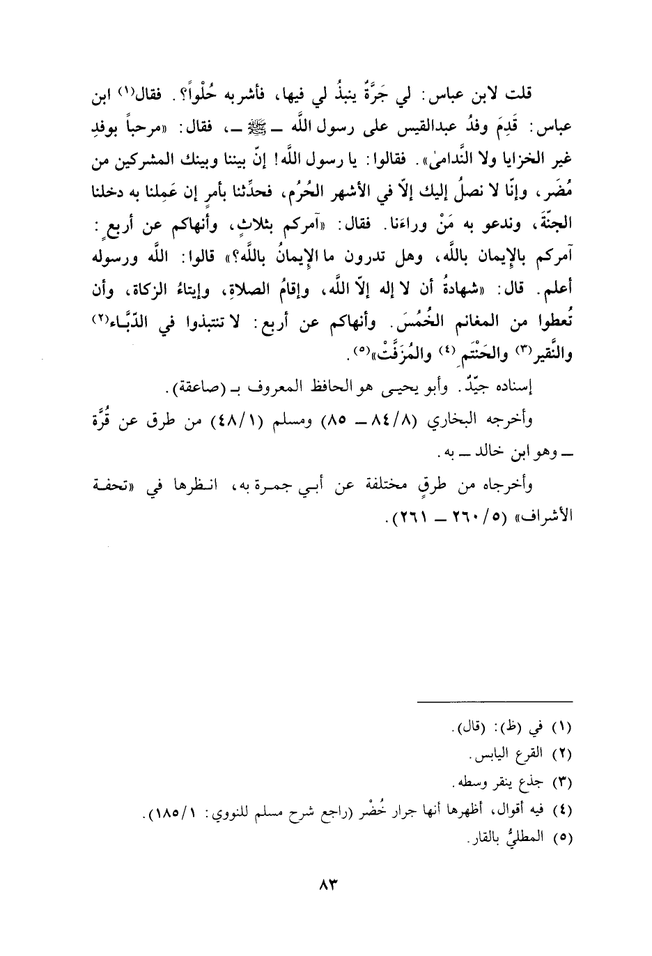 قلت لابن عباس: لي جَرَّةٌ ينبذُ لي فيها، فأشربه حُلْوًا؟. فقال (¬1) ابن عباس: قَدِمَ وفدُ عبد القيس على رسول الله - صلى الله عليه وسلم -، فقال: "مرحبًا بوفدِ غير الخزايا ولا النَّدامى". فقالوا: يا رسول الله! إنّ بيننا وبينك المشركين من مُضَر، وإنّا لا نصلُ إليك إلَّا في الأشهر الحُرُم، فحدِّثنا بأمرٍ إن عَمِلنا به دخلنا الجنّةَ، وندعو به مَنْ وراءَنا. فقال: "آمركم بثلاثٍ، وأنهاكم عن أربعٍ: آمركم بالإِيمان بالله، وهل تدرون ما الإِيمانُ بالله؟ " قالوا: الله ورسوله أعلم. قال: "شهادةُ أن لا إله إلَّا الله، وإقامُ الصلاةِ، وإيتاءُ الزكاة، وأن تُعطوا من المغانم الخُمُسَ. وأنهاكم عن أربع: لا تنتبذوا في الدّبَّاء (¬2) والنَّقير (¬3) والحَنْتَمِ (¬4) والمُزَفَّتْ" (¬5).