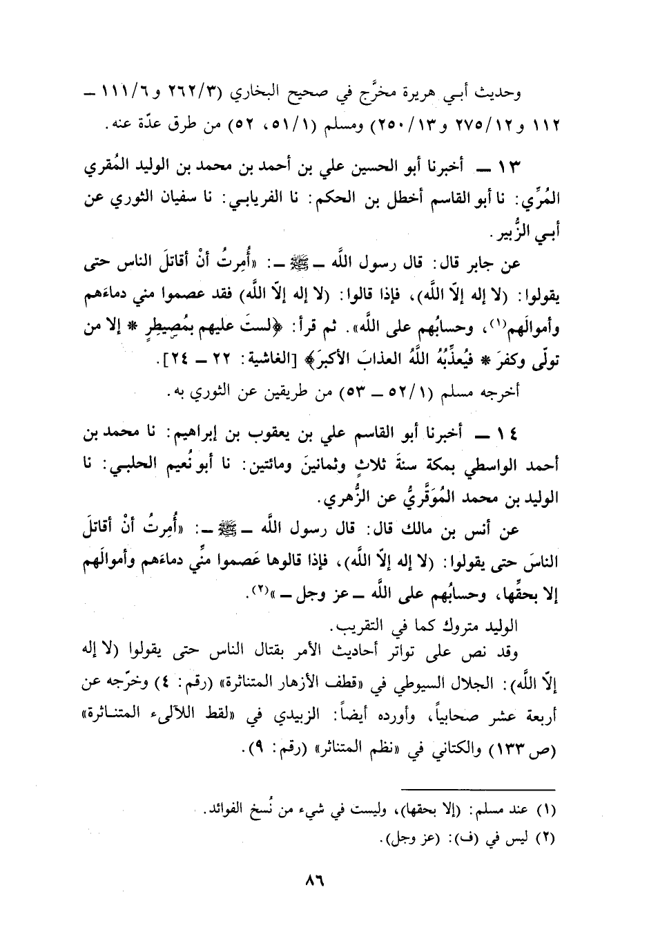 وقد نص على تواتر أحاديث الأمر بقتال الناس حتى يقولوا (لا إله إلَّا الله): الجلال السيوطي في "قطف الأزهار المتناثرة" (رقم: 4) وخرّجه عن أربعة عشر صحابيًا، وأورده أيضًا: الزبيدي في "لقط اللآلئ المتناثرة" (ص 133) والكتاني في "نظم المتناثر" (رقم: 9).