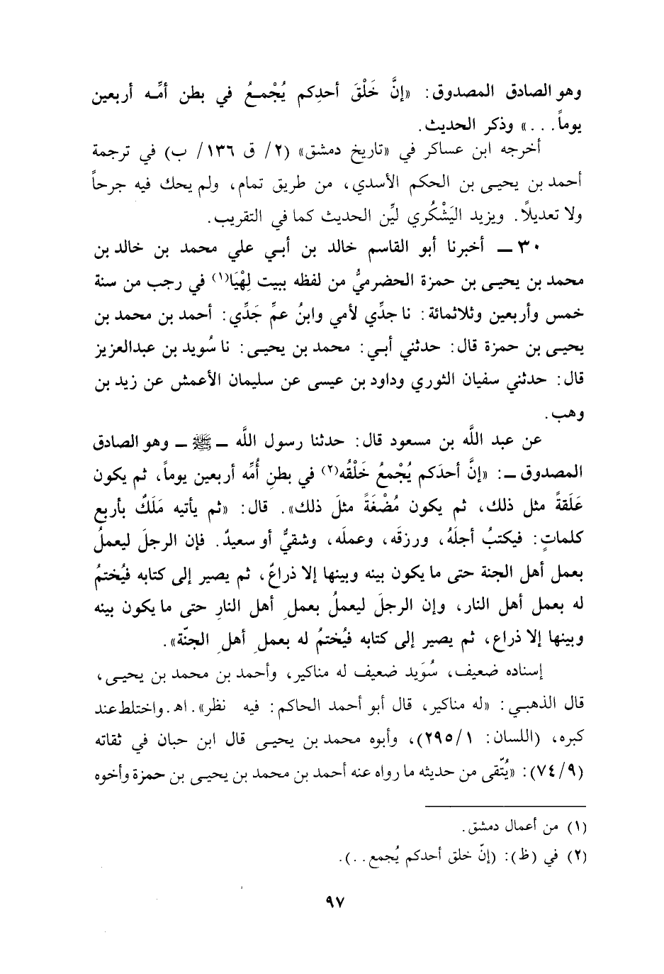 عن عبد الله بن مسعود قال: حدثنا رسول الله - صلى الله عليه وسلم - وهو الصادق المصدوق-: "إنَّ أحدَكم يُجْمعُ خَلْقُه (¬2) في بطنِ أمِّه أربعين يومًا، ثم يكون عَلَقةً مثل ذلك، ثم يكون مُضْغَةً مثلَ ذلك". قال: "ثم يأتيه مَلَكٌ بأربع كلماتٍ: فيكتبُ أجلَهُ، ورزقَه، وعملَه، وشقيٌّ أو سعيدٌ. فإن الرجلَ ليعملُ بعمل أهل الجنة حتى ما يكون بينه وبينها إلا ذراعٌ، ثم يصير إلى كتابه فيُختمُ له بعمل أهل النار، وإن الرجلَ ليعملُ بعملِ أهل النارِ حتى ما يكون بينه وبينها إلا ذراع، ثم يصير إلى كتابه فيُختمُ له بعملِ أهلِ الجنّة".