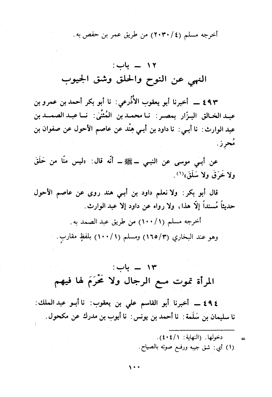 493 - أخبرنا أبو يعقوب الأَذْرعي: نا أبو بكر أحمد بن عمرو بن عبد الخالق البزّار بمصر: نا محمد بن المُثَّنى: نا عبد الصمد بن عبد الوارث: نا أبي: نا داود بن أبي هِنْد عن عاصم الأحول عن صفوان بن مُحرِز.