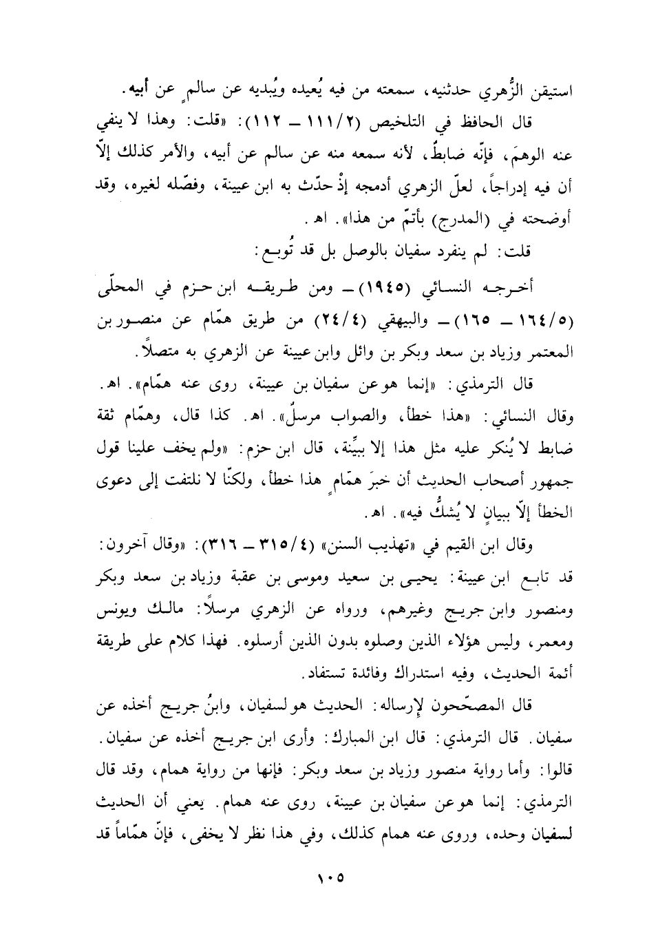 وقال ابن القيم في "تهذيب السنن" (4/ 315 - 316): "وقال آخرون: قد تابع ابن عيينة: يحيى بن سعيد وموسى بن عقبة وزياد بن سعد وبكر ومنصور وابن جريج وغيرهم، ورواه عن الزهري مرسلًا: مالك ويونس ومعمر، وليس هؤلاء الذين وصلوه بدون الذين أرسلوه. فهذا كلام على طريقة أئمة الحديث، وفيه استدراك وفائدة تستفاد.