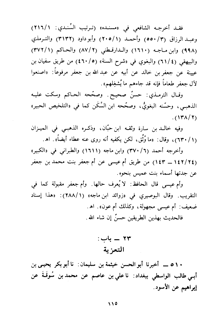 فقد أخرجه الشافعي في "مسنده" (ترتيب السِّندي: 1/ 216) وعبد الرزاق (3/ 550) وأحمد (1/ 205) وأبو داود (3132) والترمذي (998) وابن ماجه (1610) والدارقطني (2/ 87) والحاكم (1/ 372) والبيهقي (4/ 61) والبغوي في "شرح السنة" (5/ 460) من طريق سفيان بن عيينة عن جعفر بن خالد عن أبيه عن عبد الله بن جعفر مرفوعًا: "اصنعوا لآل جعفر طعامًا فإنه قد جاءهم ما يُشغِلهم".